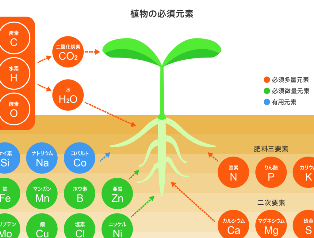 肥料成分には多くの種類がありますが、主なものは以下の通りです。
