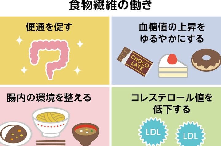 食物繊維が健康に与える影響は多岐にわたります。たとえば、食物繊維を十分に摂取すると、以下の効果が期待できます。