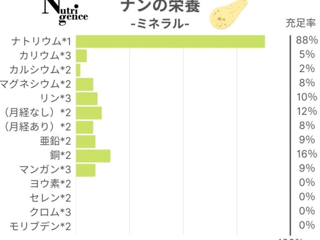 ナンには、ビタミンやミネラルも含まれています。小麦粉から得られるビタミンB群(特にB1、B2、B3)は、エネルギー代謝に役立ち、健康を維持するのに必要な栄養素です。また、ミネラルとしては、鉄分やカルシウムが含まれ、体の機能や骨の健康をサポートします。以下のような栄養素が主に含まれます。