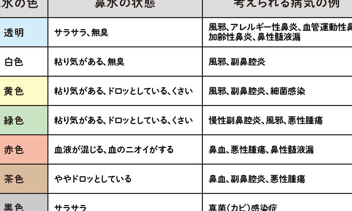 - 変色: 黄色や緑色の鼻水は、感染症の兆候であるかもしれません。