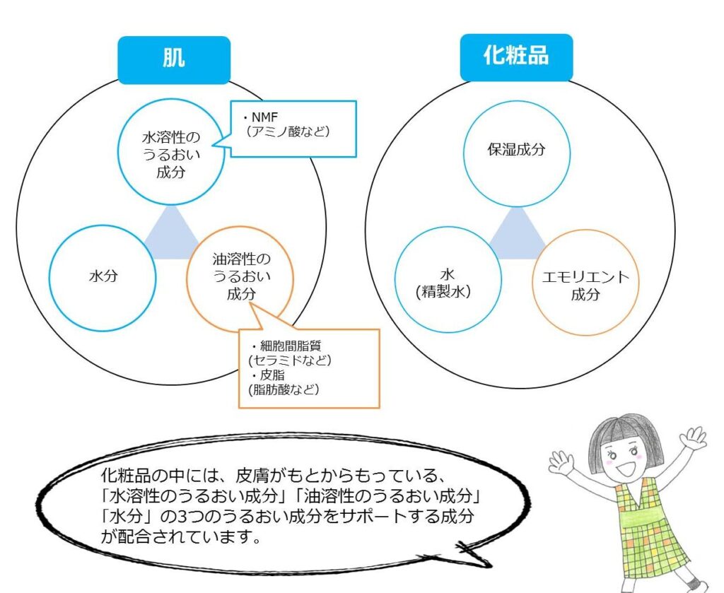 - ヒアルロン酸:水分を抱える性質があり、肌をしっとりと保ちます。