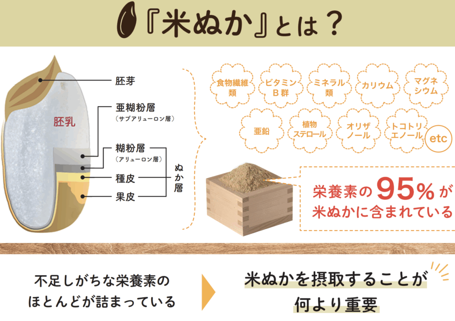 ぬかには多様な栄養成分が含まれており、健康維持や美容に寄与します。特に、ビタミンB群やミネラルが豊富で、重要な役割を果たしています。