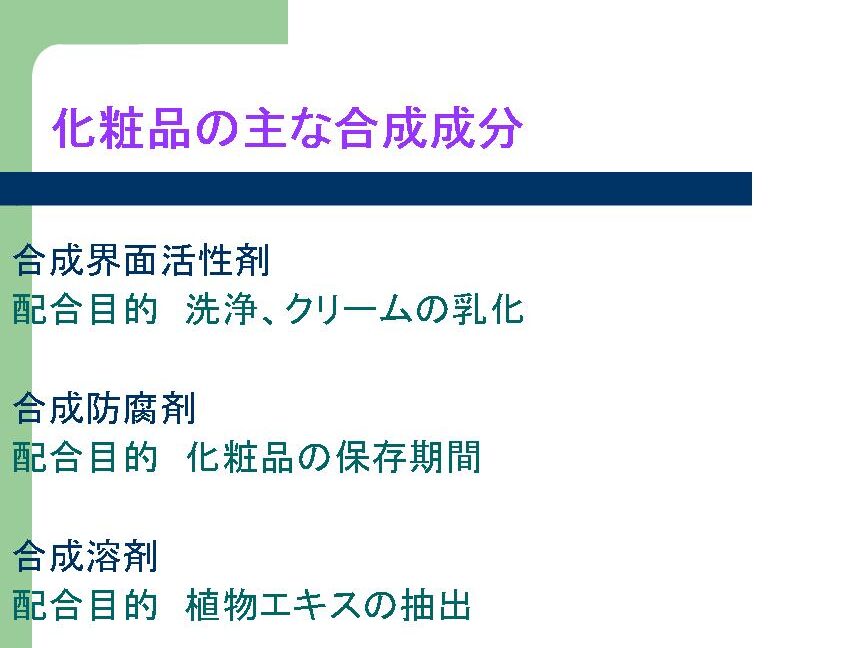 - パラベン: 多くの化粧品に使用され、細菌やカビの繁殖を防ぎます。