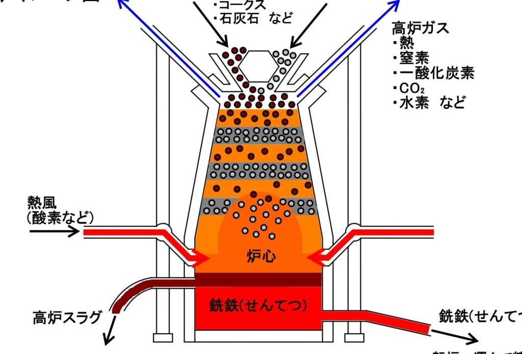 - 高炉による製造: 鉄鉱石、コークス、石灰石を高炉に投入口から投入し、数千度の高温で還元反応を起こす。鉄鉱石の鉄分がコークスと反応し、純粋な鉄が得られる。