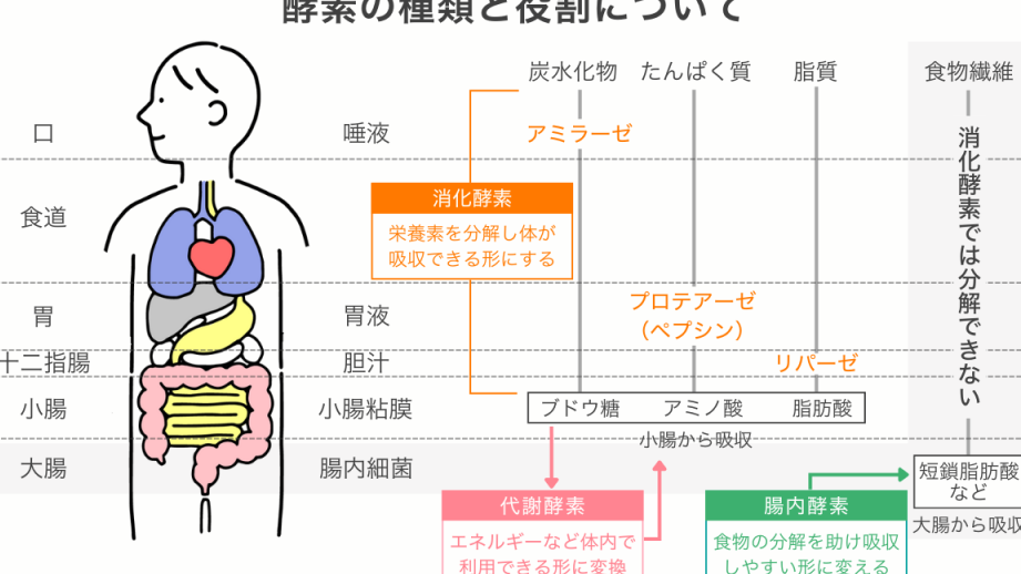 酵素には様々な種類があり、それぞれ異なる機能を持っています。主に消化酵素と代謝酵素が重要な役割を果たしています。以下で、それぞれの種類を詳しく見ていきます。
