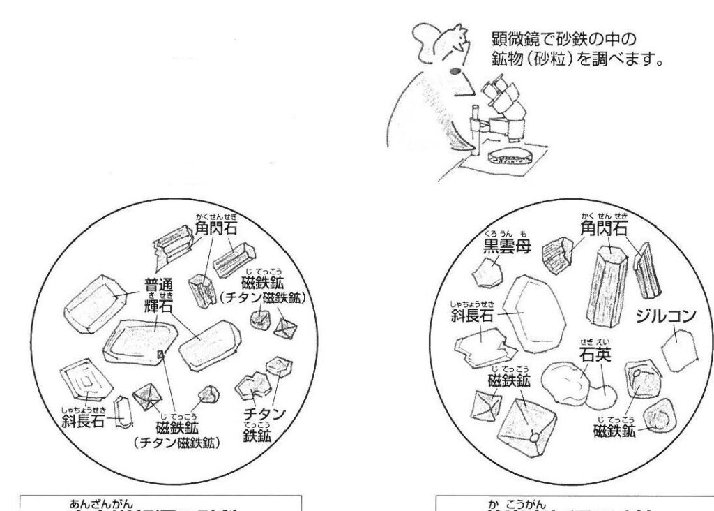 微量成分には、多様な鉱物が含まれ、これが砂鉄の性質を多様化します。例えば、鉄鉱石以外の成分が次のように含まれています: