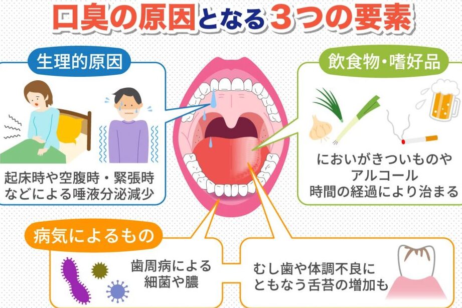- 虫歯や歯周病: これらの疾患は細菌が繁殖する環境を提供し、口臭を悪化させる。