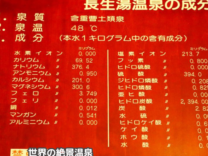 温泉成分表は、温泉に含まれる化学成分やその特徴を示す重要な資料です。温泉の効能を正確に理解するためには、この成分表が欠かせません。