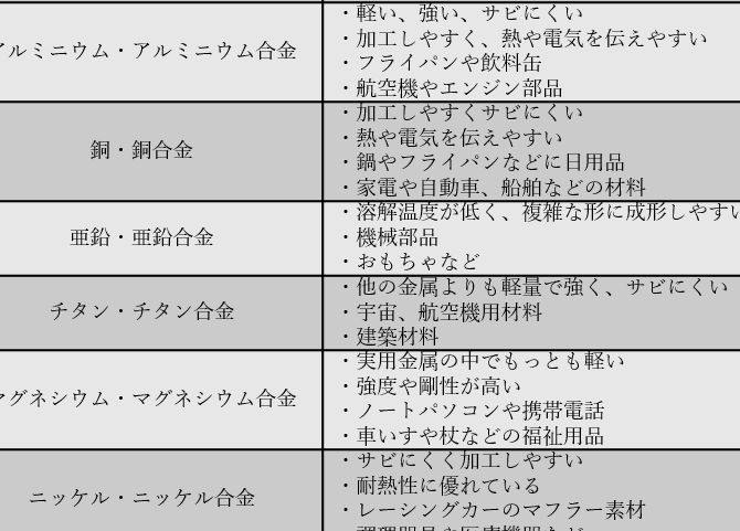 - 鋼: 鉄と炭素の合金で、強度が高い。炭素含量によって強度や硬度が変わる。