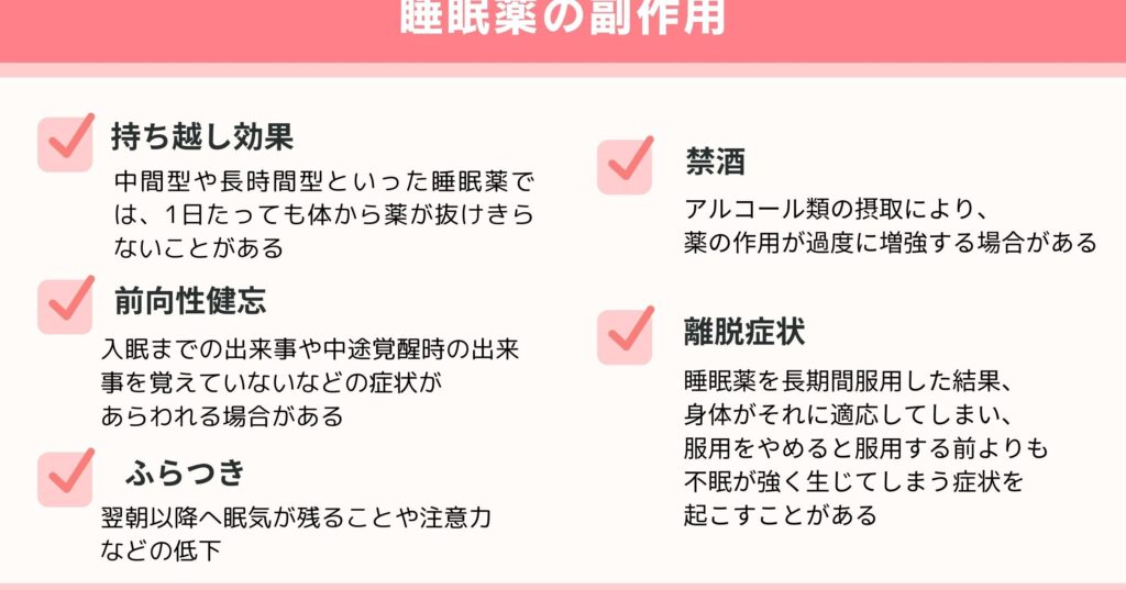 - 翌日の倦怠感:睡眠薬の効果が残り、翌日の活動に影響を及ぼす場合があります。