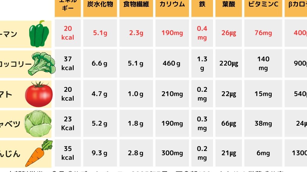 - ビタミンC: ピーマン100gあたり、約80mgのビタミンCが含まれています。この成分は免疫力を高め、抗酸化作用があります。
