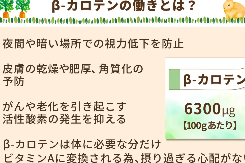 - 視力保護: β-カロチンは夜間の視力向上に寄与します。
