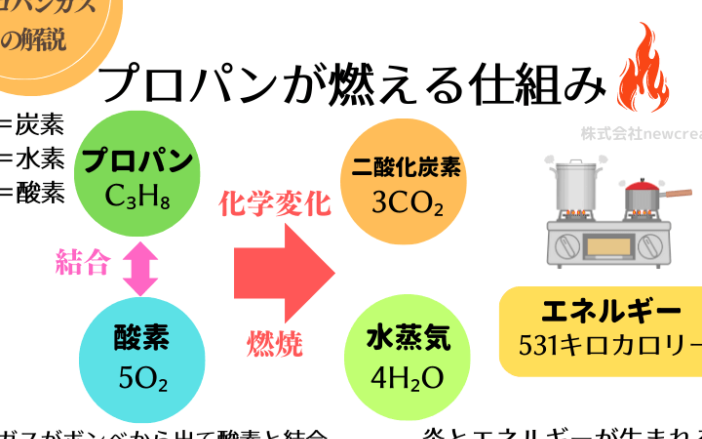 LPGの化学的特性も重要な要素です。LPGは、主に炭素と水素から構成されています。そのため、燃焼時には以下のような化学反応が起こります。
