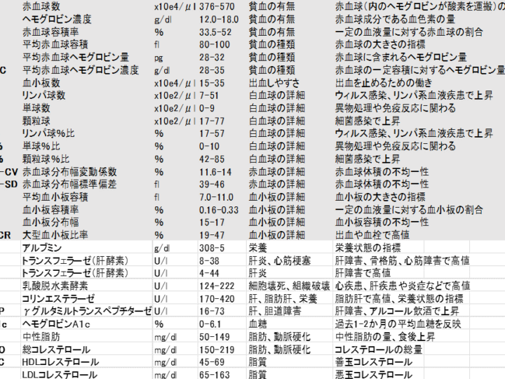 正常値は、私たちの体内の一般的な健康状態を示します。異常値は、健康リスクや潜在的な病気の兆候を示すことがあります。以下に、主要な血液成分の正常値の例を示します。