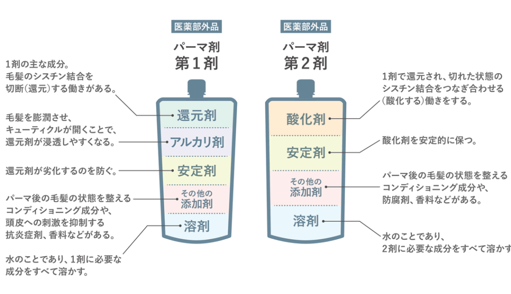 パーマ剤は、様々な成分から構成されており、それぞれが特定の役割を持っています。以下の成分について詳しく解説します。