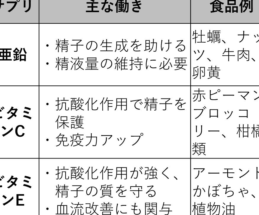 - ビタミンC: 精子の抗酸化物質として働くため、精子の健康維持に寄与する。