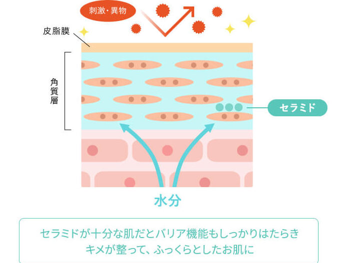- セラミドは、肌の角層に存在し、水分の蒸発を防ぎます。