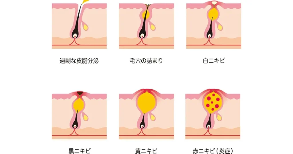 ニキビ改善におけるメカニズムは、成分の協力によって成り立っています。具体的には、以下のプロセスがあります。
