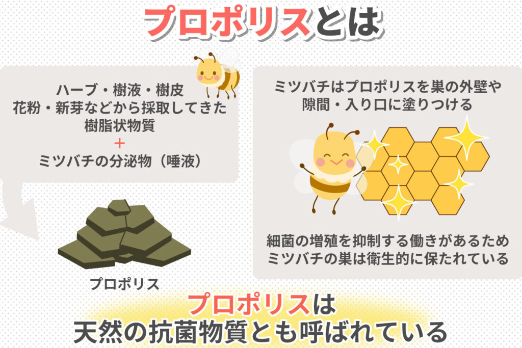 プロポリスは、ミツバチが樹木や植物の樹脂を集めて作る天然物質です。プロポリスにはフラボノイド、フェノール酸、ミネラル、ビタミンなどが含まれています。これらの成分は、抗菌作用や抗炎症作用に寄与し、健康をサポートします。