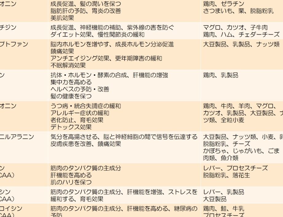 - 必須アミノ酸: 食事から摂取が必要で、体内で合成できません。以下が必須アミノ酸の一覧です。