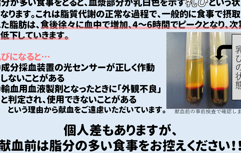 - 献血者の回復が早い。全血献血に比べて、体に戻される成分が多いため、献血後の体への負担が軽減されます。