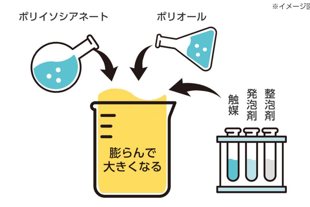イソシアネートとポリオールが化学反応を起こし、ウレタン結合を形成します。この反応は、温度や圧力の条件により調整されます。
