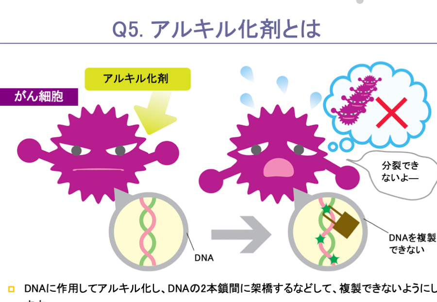- アルキル化剤:DNAの構造を変化させ、細胞分裂を阻害