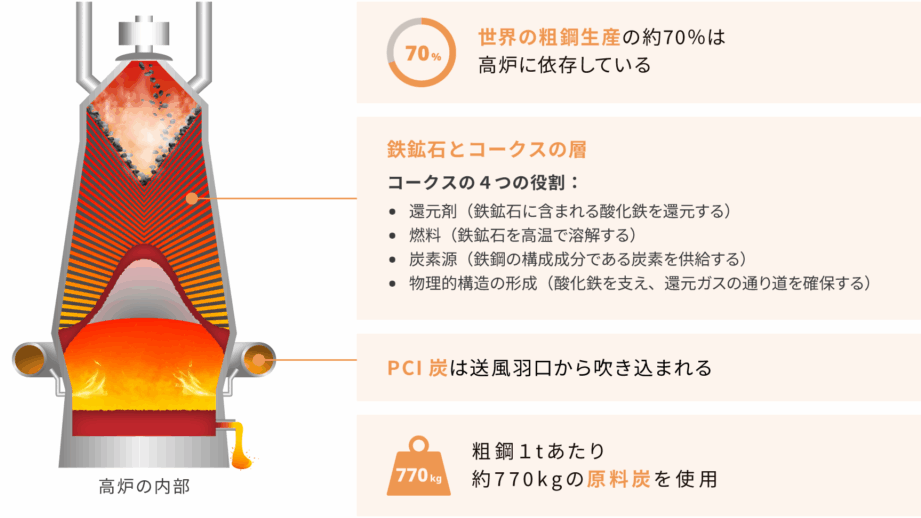- 高温を提供: コークスの燃焼により、炉内温度が上昇し、鉄鉱石の還元が効率的に行われます。