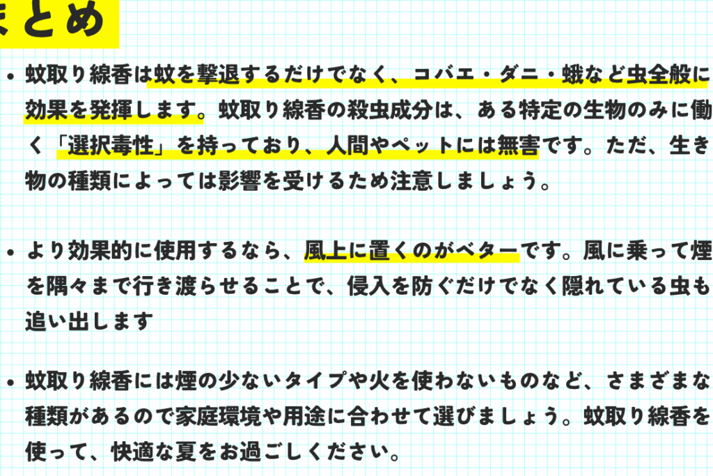 使用時の注意点を守ることで私たちはより安全に蚊取り線香を活用できます。成分の特性を知り適切に使用することで快適な空間を維持し蚊のストレスから解放されることができるでしょう。