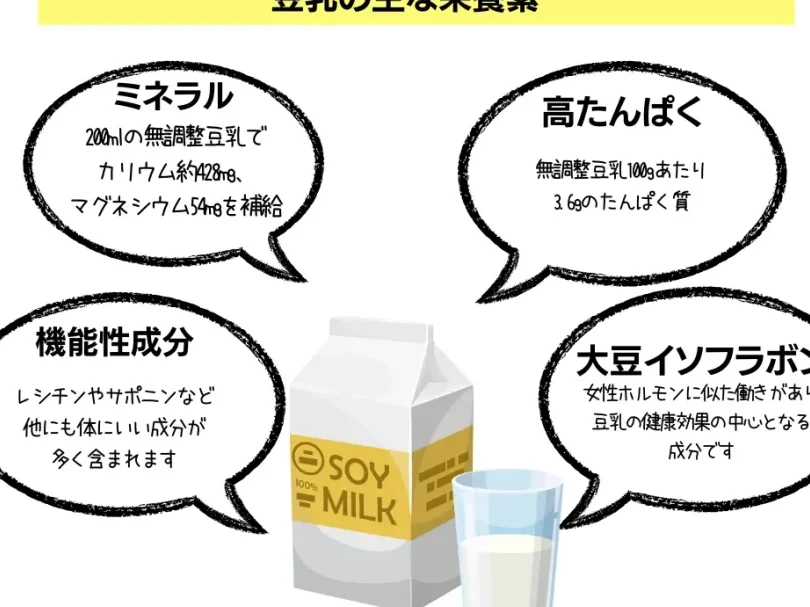 - ビタミンとミネラル:無調整豆乳には、ビタミンB群、ビタミンE、カルシウム、マグネシウムなどが含まれています。これらは、骨の健康や免疫力の向上に寄与します。