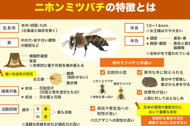 - 日本ミツバチ:日本固有の種で、寒冷地でも活動します。