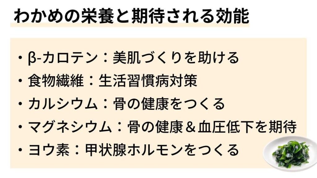 わかめには以下のような重要なビタミンとミネラルが含まれています。