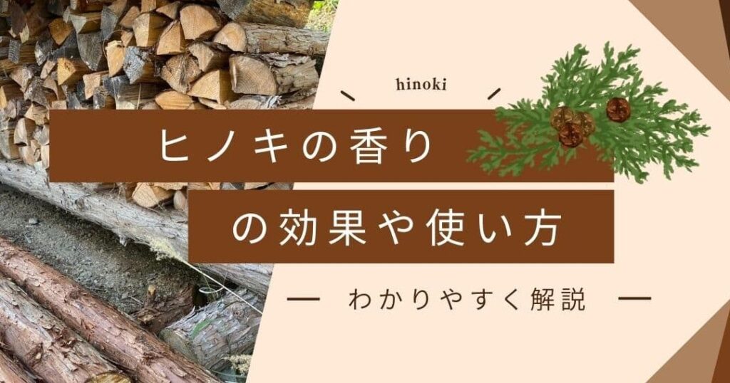 ヒノキの香りは、さまざまな方法で利用できる。まず、アロマセラピーにおいて、ヒノキの精油はリラックスやストレス緩和を目的に利用される。ヒノキオイルをディフューザーで使用すると、空間全体にヒノキの心地よい香りが広がり、落ち着いた雰囲気を作り出す。