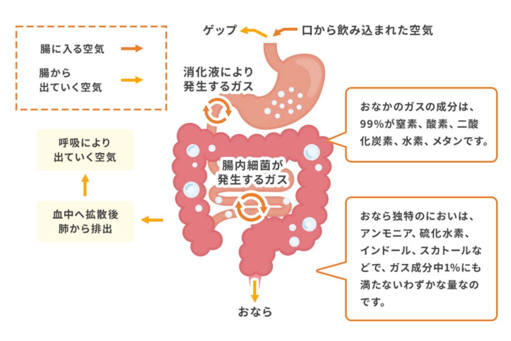 これらの成分が合わさることで、おならの特徴的な臭いが生じます。