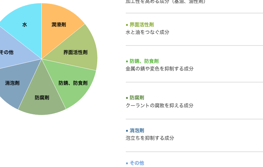 - 界面活性剤:水と油を混合し、効果的に冷却と潤滑を実現します。