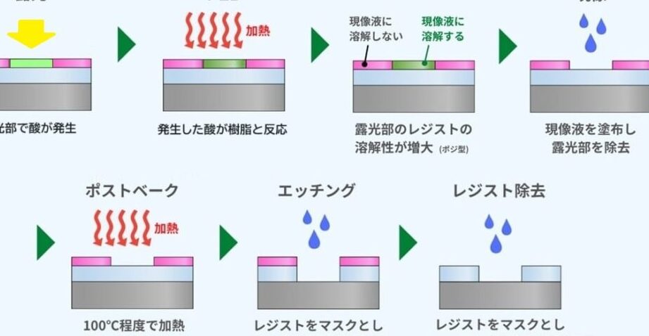 - 正型フォトレジスト: 光照射前の状態が保持され、露光後に未照射部分が残る。