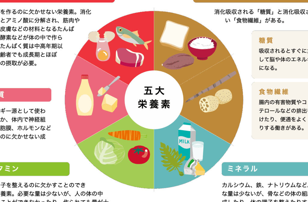 - ミネラル: 骨や歯の健康を保つカルシウムや、神経の正常な機能を支えるナトリウム・カリウムなどが必要です。