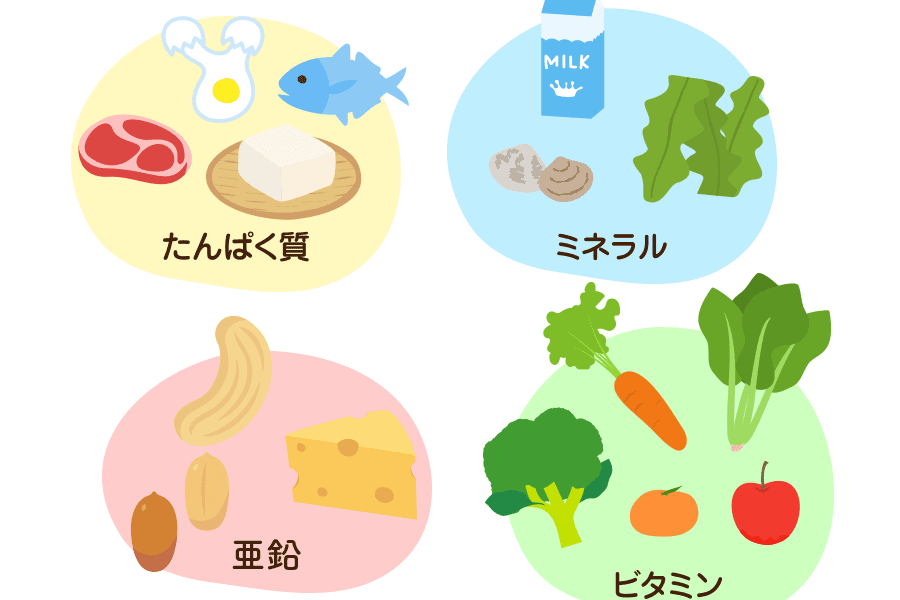 髪の成長と健康に必要な栄養素は以下の通りです。