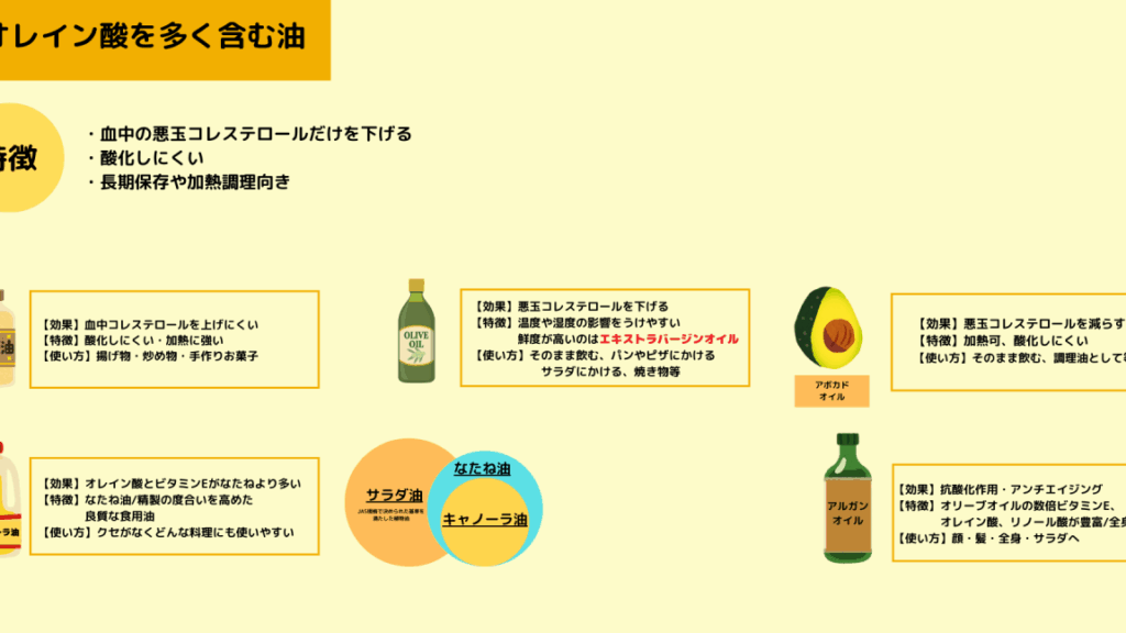 - キャノーラ油: 低コレステロールで、比較的高い煙点を持ち、揚げ物に適している。