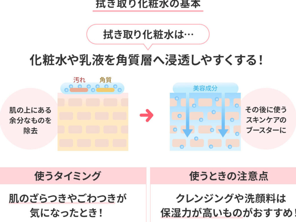 このような成分を含む拭き取り化粧水は、肌の滑らかさを向上させ、化粧のノリをよくします。