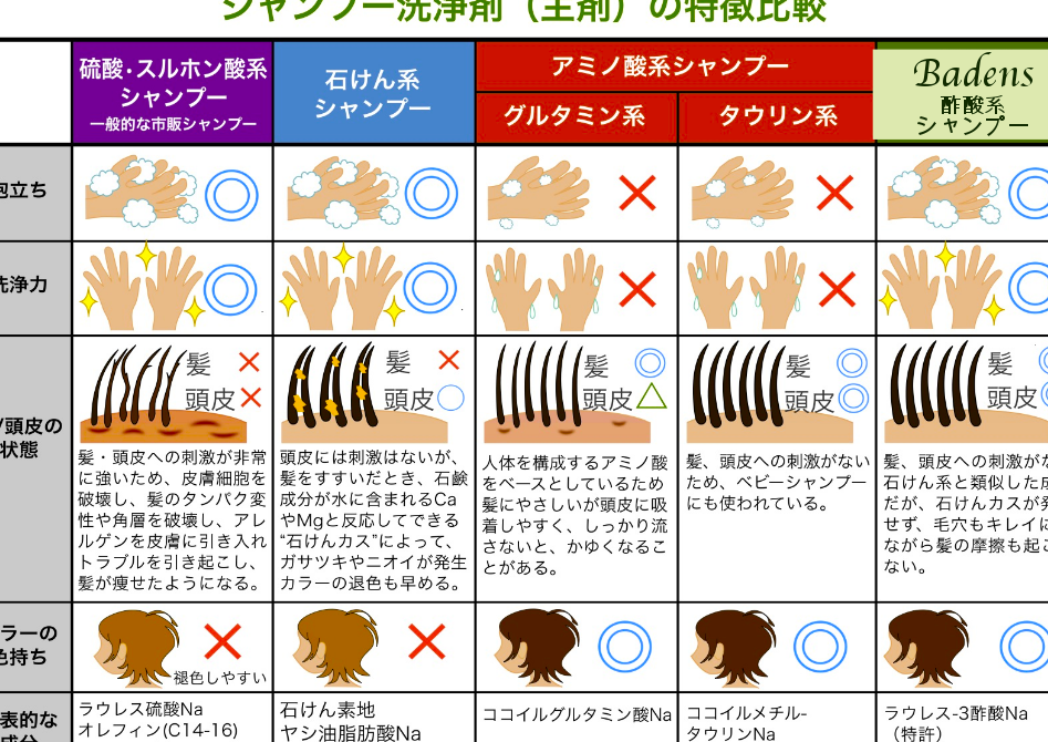 シャンプーに含まれる洗浄成分は、その効果に大きく影響します。以下の成分が一般的に使われます。