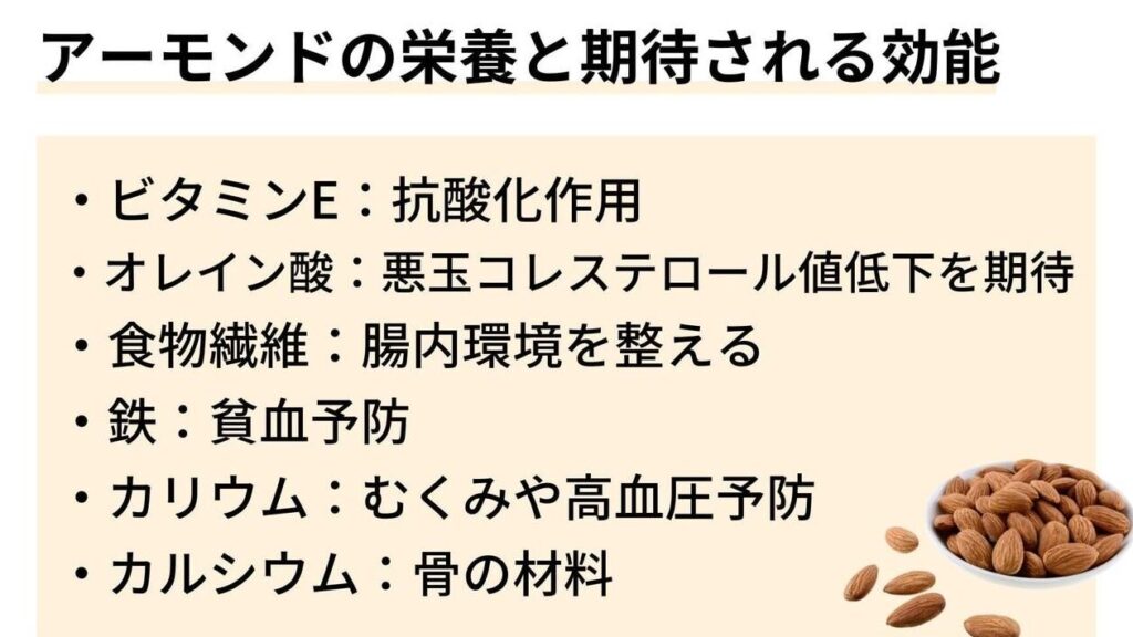 アーモンドには特に以下の栄養成分が含まれています。