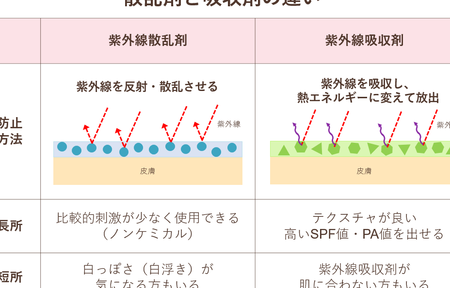 紫外線吸収剤とは、紫外線を吸収し、肌への影響を軽減する成分です。これらの成分には、有機と無機の2種類があります。