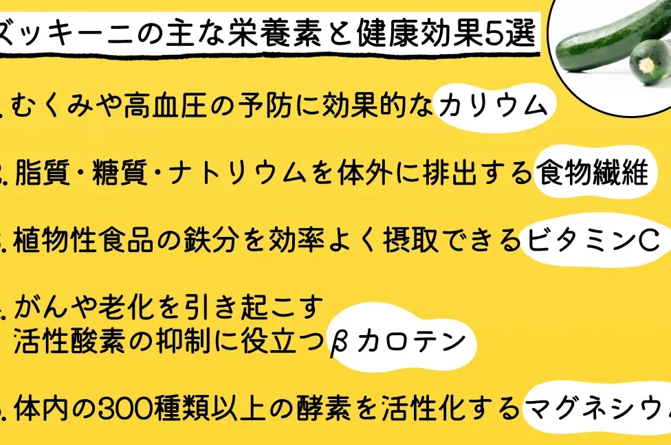 ズッキーニは、さまざまな健康効果を持つ食材です。その栄養素は、私たちの生活にポジティブな影響を与えます。特に、以下の点で効果が期待できます。