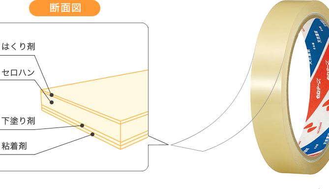 セロハンテープは、透明または半透明のフィルムでできた粘着テープです。一般的に、プラスチック素材の基材にアクリル系やゴム系の粘着剤を使用しています。この粘着剤成分が、物体を強力に接着する機能を果たします。セロハンテープは、粘着面を剥がすと簡単に手で扱うことができ、また再剥離性も持っているため、元の位置に戻すことも可能です。