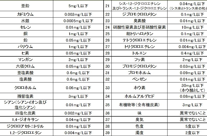 - pH値: 水の酸性度を示し、健康に与える影響がある。