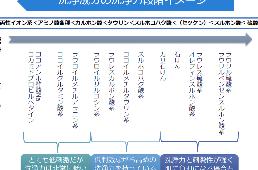 - 非イオン界面活性剤: 刺激が少なく、敏感肌向けの製品に使われることが多いです。