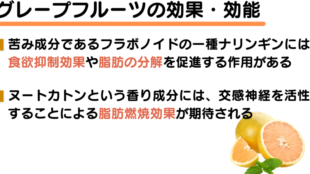 - 脂肪燃焼促進: ナリンゲニンやリモネンによって脂肪の代謝を支援します。