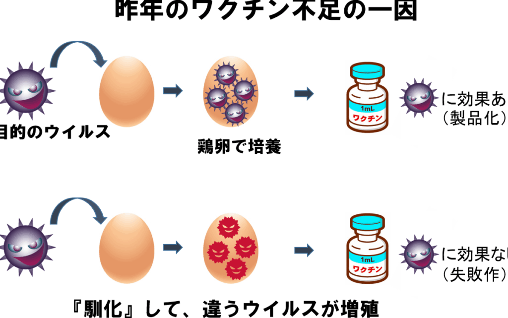 - 培養基: ウイルスを培養するための基盤として、鶏卵などの動物由来の成分が使用されることがあります。